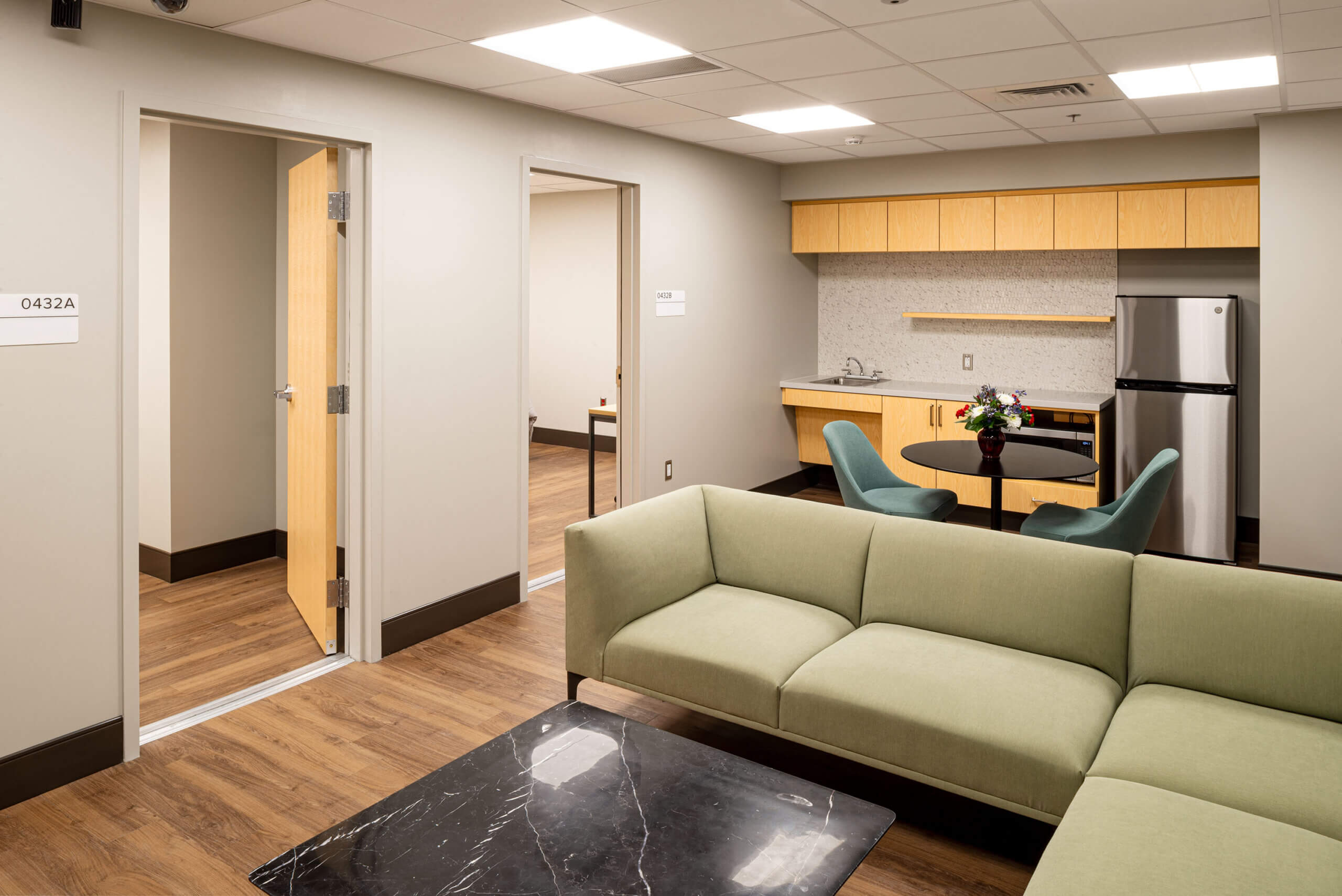 The University’s new research facility is a state-of-the art sleep center organized into five distinct functional zones: 6 sleep suites: 10 test rooms with 2 exam rooms, laboratory space, administrative space, and community interfaces. The community interface provides reception and subject registration, meeting space, consult and training rooms with open stations for form work and data collection. The sleep suites are intended for overnight and long-term sleep studies, without providing day or night reference cues.