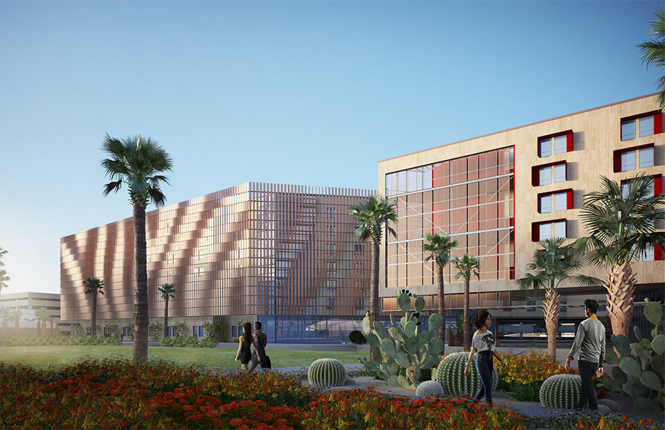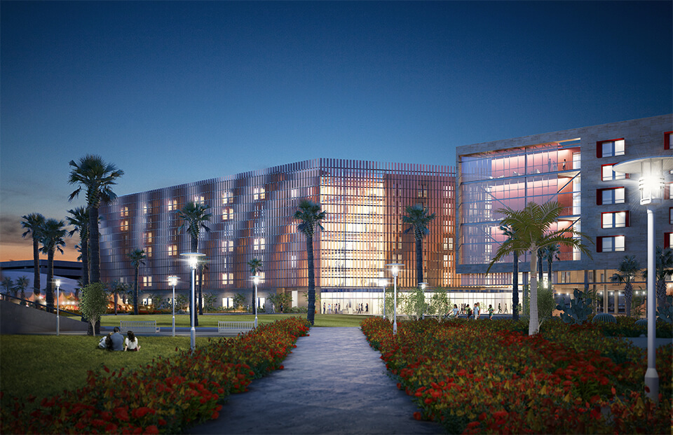 This fall ASU unveiled a new $120M residence hall for engineering students featuring on-site digital classrooms and makerspaces with 3D printers, laser cutters and other design tools. GLHN partnered with American Campus Communities to provide fast-track Mechanical, Electrical and Plumbing design services for the 7-story, 458,000 SF Tooker House which is seeking LEED Gold certification. Mechanical systems in the building are on display, feeding into an engineer’s desire to see how things work. The project houses 1,600 students who enjoy special features such as onsite dining and Bluetooth-enabled laundry rooms that notify them when their clothes are dry. The project architect was Solomon Cordwell Buenz, the contractor was Okland Construction. Renderings by Solomon Cordwell Buenz. Photo by Deanna Dent/ASU Now.
